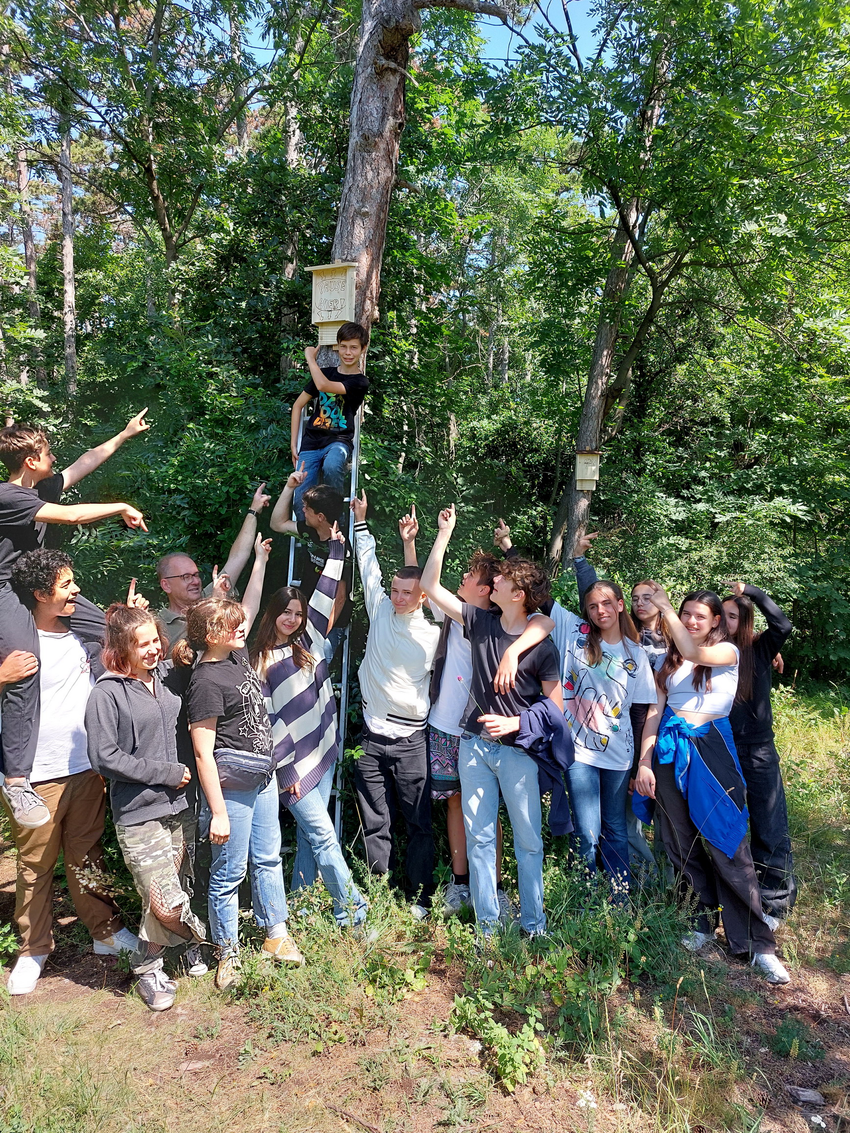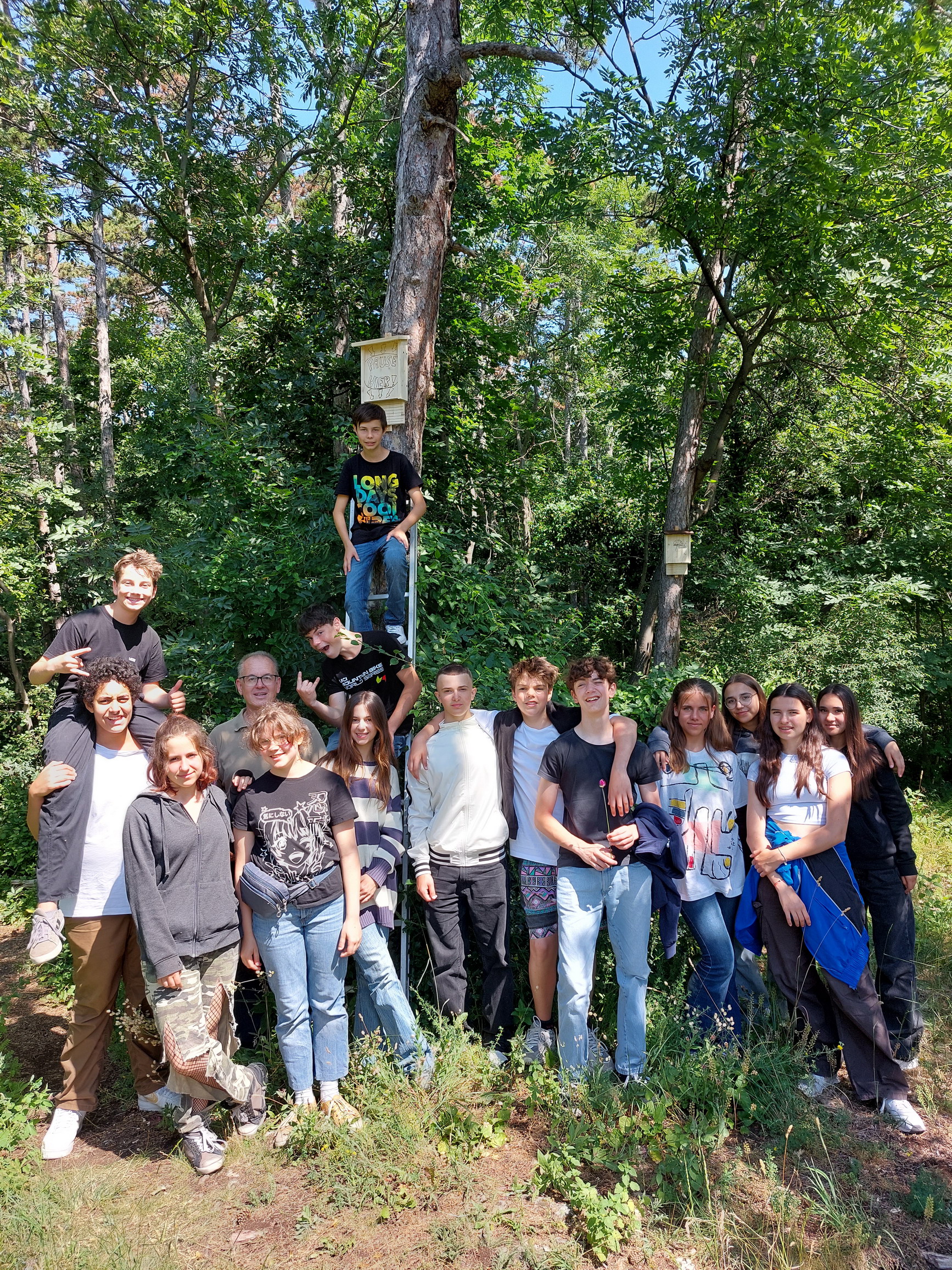 Am letzten Schultag zogen dann alle los Richtung Anninger und montierten die Nistkästen an geeigneten Stellen.