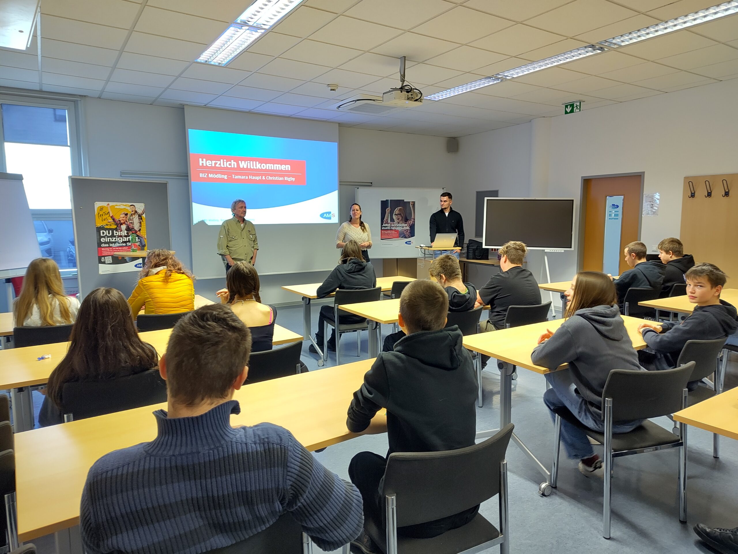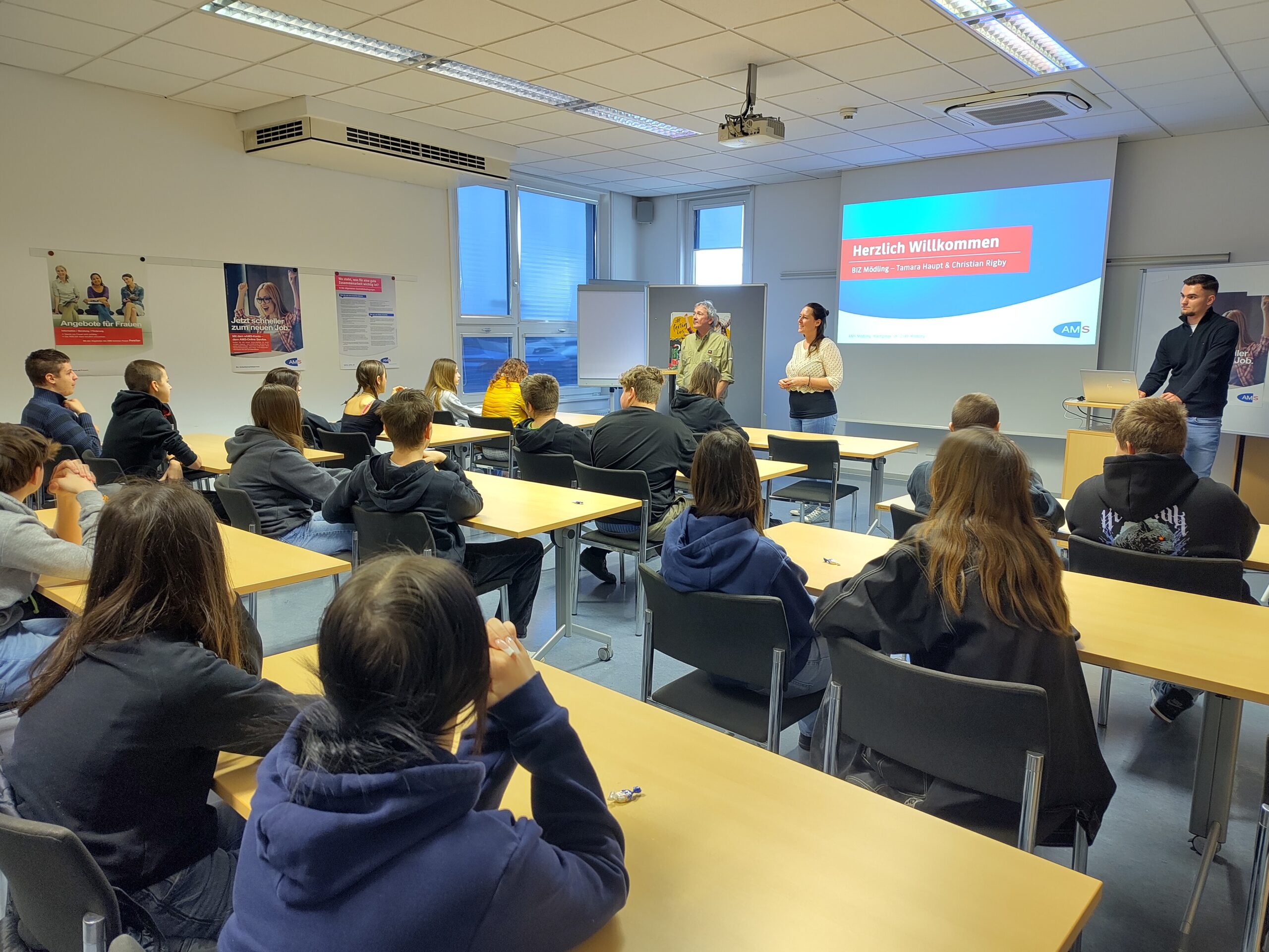 Im Rahmen der Bildungs- und Berufsorientierung besuchten die Regelschüler*innen der 4. Klassen am 5. März 2024 das Berufsinformationszentrum des AMS Mödling. Nach einer kurzen Vorstellungsrunde, in der die Schüler*innen mit konkreten Zukunftsplänen beeindrucken konnten, wurden von Tamara Haupt und Christian Rigby (beide AMS Mödling) die wichtigsten Infos und Tipps zu Aufnahmetests und Assessment-Centern vorgestellt. Danach ging es in die praktische Umsetzung: Die Schüler*innen mussten einen Test bearbeiten, der aus realen Aufgabenstellungen von Mödlinger und Badener Firmen bestand. Die Auswertung übernahm das Team des AMS, die Besprechung der Ergebnisse erfolgt im Rahmen des Unterrichts in der Schule. Wir wünschen allen Schüler*innen viel Erfolg für die realen Aufnahmeverfahren und Vorstellungsgespräche!